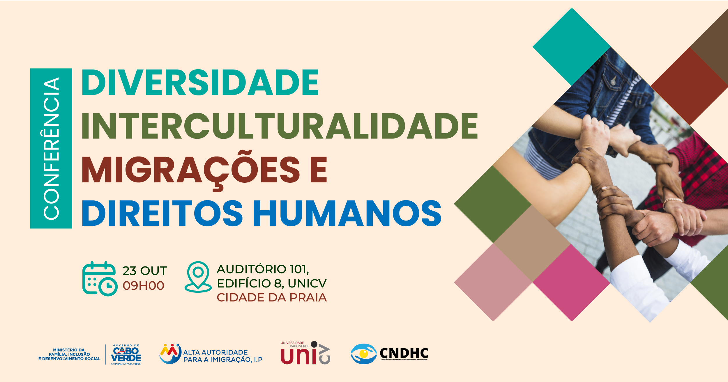 A Universidade de Cabo Verde (Uni-CV), em parceria com a Alta Autoridade para a Imigração e a Comissão Nacional para os Direitos Humanos e a Cidadania, vai realizar a conferência “Diversidade, Interculturalidade, Migrações e Direitos Humanos” nesta quarta-feira, dia 23 de outubro, às 9 horas, no auditório 101 do Campus do Palmarejo Grande. O evento, com duração de duas horas, pretende promover a reflexão e a partilha de conhecimento sobre migrações, diversidade cultural e a promoção dos Direitos Humanos.