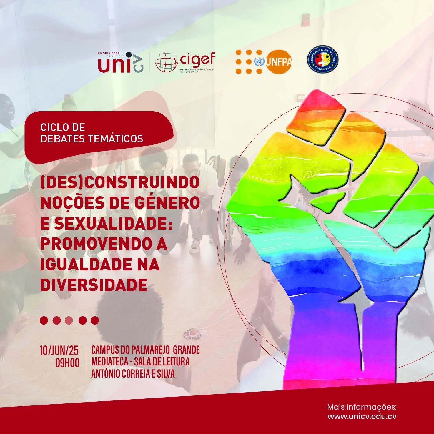 No âmbito das celebrações do Mês do Orgulho LGBTQIA+, o Centro de Investigação em Género e Família (CIGEF) da Universidade de Cabo Verde (Uni-CV), em parceria com a Companhia de Teatro Fladu Fla e com o apoio do UNFPA, promoverá o ciclo de debates temáticos “(Des)construindo Noções de Género e Sexualidade: Promovendo a Igualdade na Diversidade”.