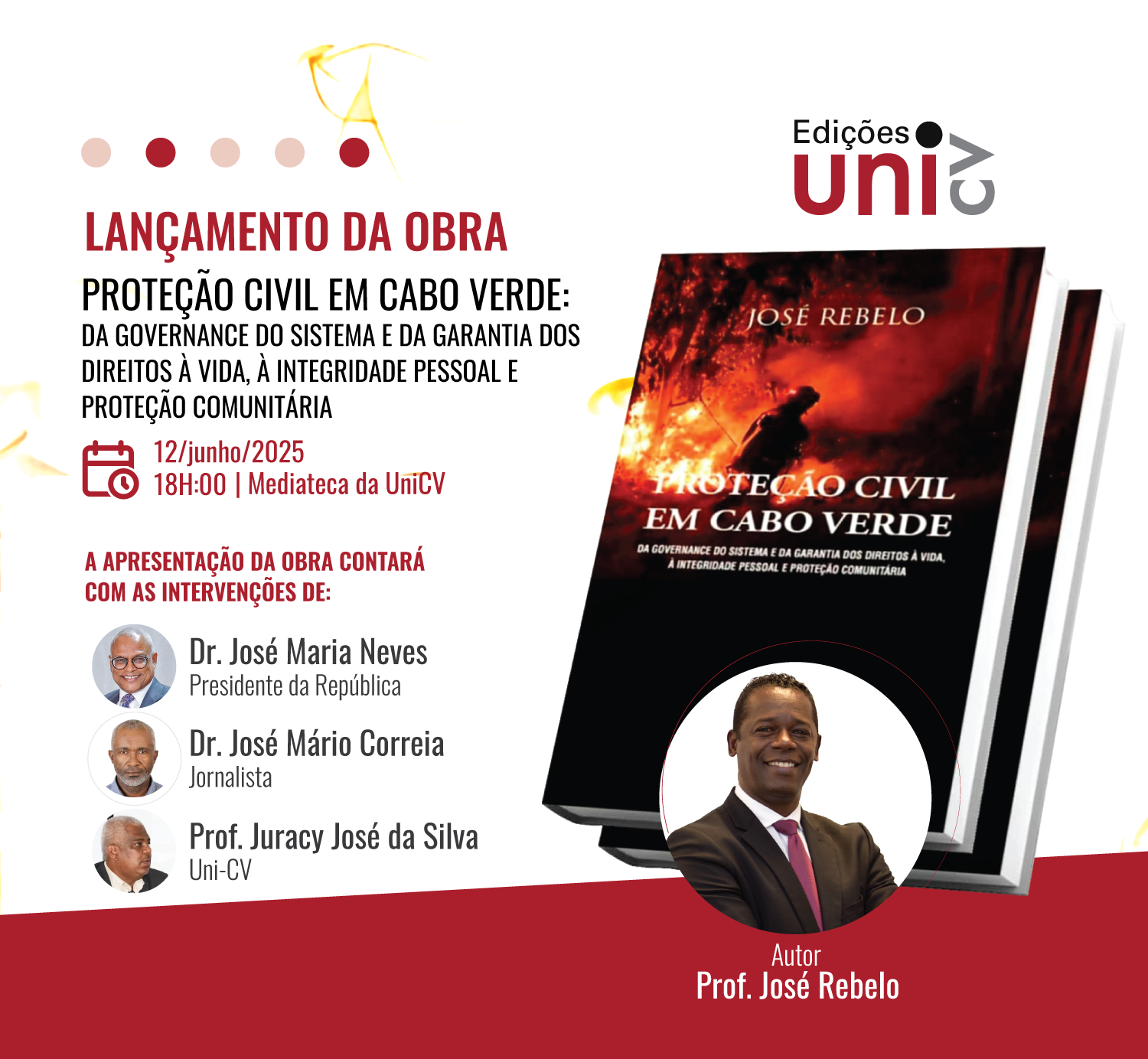 A Universidade de Cabo Verde (Uni-CV) promoverá, no dia 12 de junho de 2025, às 18h00, na Sala António Correia e Silva – Mediateca do Campus Palmarejo Grande, o lançamento do livro intitulado “Proteção Civil em Cabo Verde: da governance do sistema e da garantia dos direitos à vida, à integridade pessoal e à proteção comunitária”, da autoria de José Rebelo, docente da Escola de Negócios e Governação da Uni-CV.