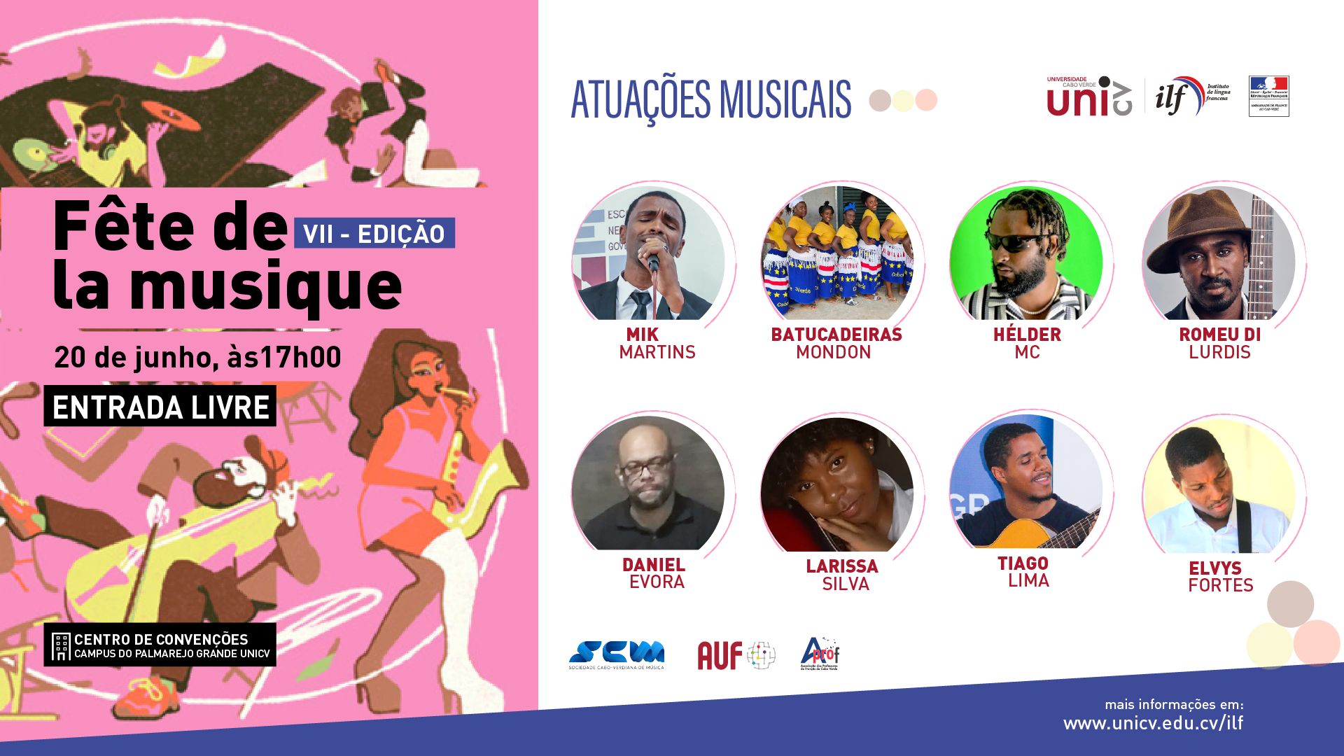 O Instituto de Língua Francesa da Uni-CV convida toda a comunidade académica e o público em geral para celebrar a VII edição da Festa da Música ( Fête de la Musique), no dia 20 de junho, às 17h, no Centro de Convenções da Uni-CV, no Campus de Palmarejo Grande.