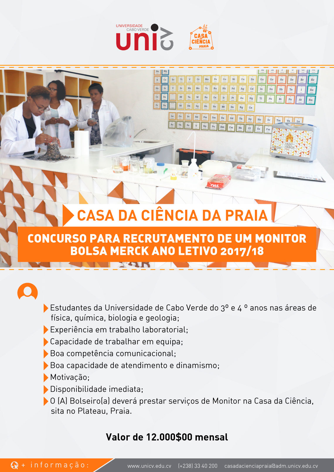 A Casa da Ciência da Praia, da Universidade de Cabo Verde, anuncia o concurso de 1 (uma) Bolsa-MERCK para o ano letivo 2017-2018, no valor de 12.000$00 mensal. A bolsa é destinada a estudantes das áreas de Física, Química, Biologia e Geologia. O(A) bolseiro(a) deverá prestar serviço de monitor(a) na Casa da Ciência, sita no Plateau, Praia.