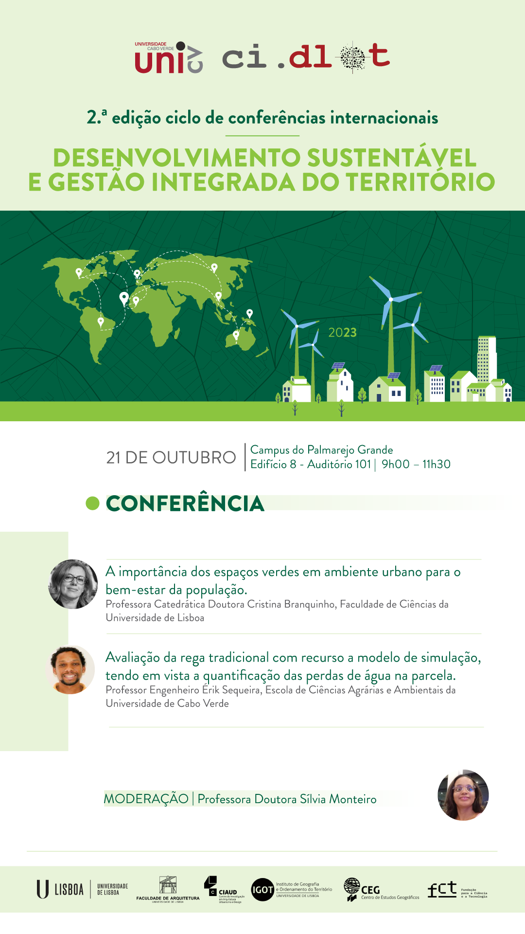 O Ciclo de Conferências Internacionais é uma iniciativa do CIDLOT, estabelecido sob a égide da nova Unidade Operacional de Investigação em Desenvolvimento Sustentável e Gestão Territorial (DSGT). O evento visa promover a partilha de conhecimentos e experiências entre investigadores, académicos, estudantes e profissionais, contribuindo para o avanço científico e para o desenvolvimento sustentável no país e na região.
