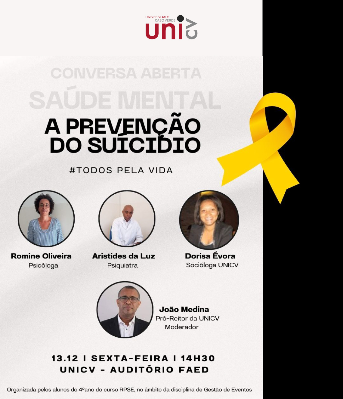 A mesa de debate será composta pela psicóloga Romine Oliveira, pelo psiquiatra Aristides da Luz e pela socióloga Dorisa Évora, que irão abordar diferentes perspetivas sobre a saúde mental e as medidas preventivas no combate ao suicídio. O evento terá como moderador o Pró-Reitor para às Àreas de Avaliação, Comunicação e Eficiência, João Almeida Medina, que guiará as discussões e contribuirá para o enriquecimento do diálogo.