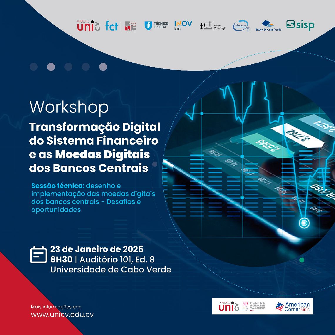A Universidade de Cabo Verde vai organizar o workshop intitulado “Transformação Digital do Sistema Financeiro e as Moedas Digitais dos Bancos Centrais”, nesta quinta-feira, dia 23 de janeiro, às 8h30, no auditório 101 do edifício 8 do Campus do Palmarejo Grande. O evento tem como objetivo promover uma discussão abrangente sobre o impacto da transformação digital nos sistemas financeiros e o papel crescente das moedas digitais emitidas pelos bancos centrais (CBDCs).