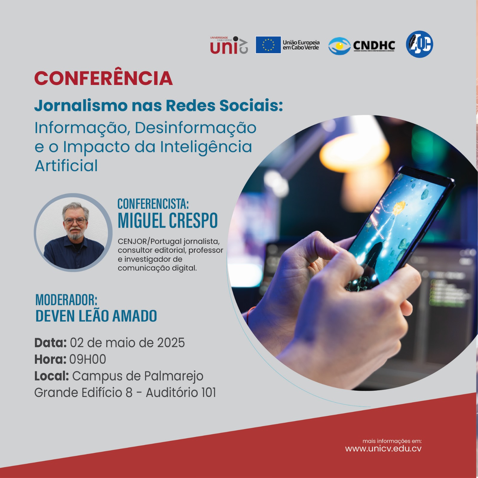Sob o tema “Jornalismo nas Redes Sociais: Informação, Desinformação e o Impacto da Inteligência Artificial”, esta conferência marca a abertura das atividades do Colóquio Internacional de Direitos Humanos da Comunicação, cuja programação principal decorrerá na próxima segunda-feira, 5 de maio, no Auditório 101 do Edifício 8, na Uni-CV.