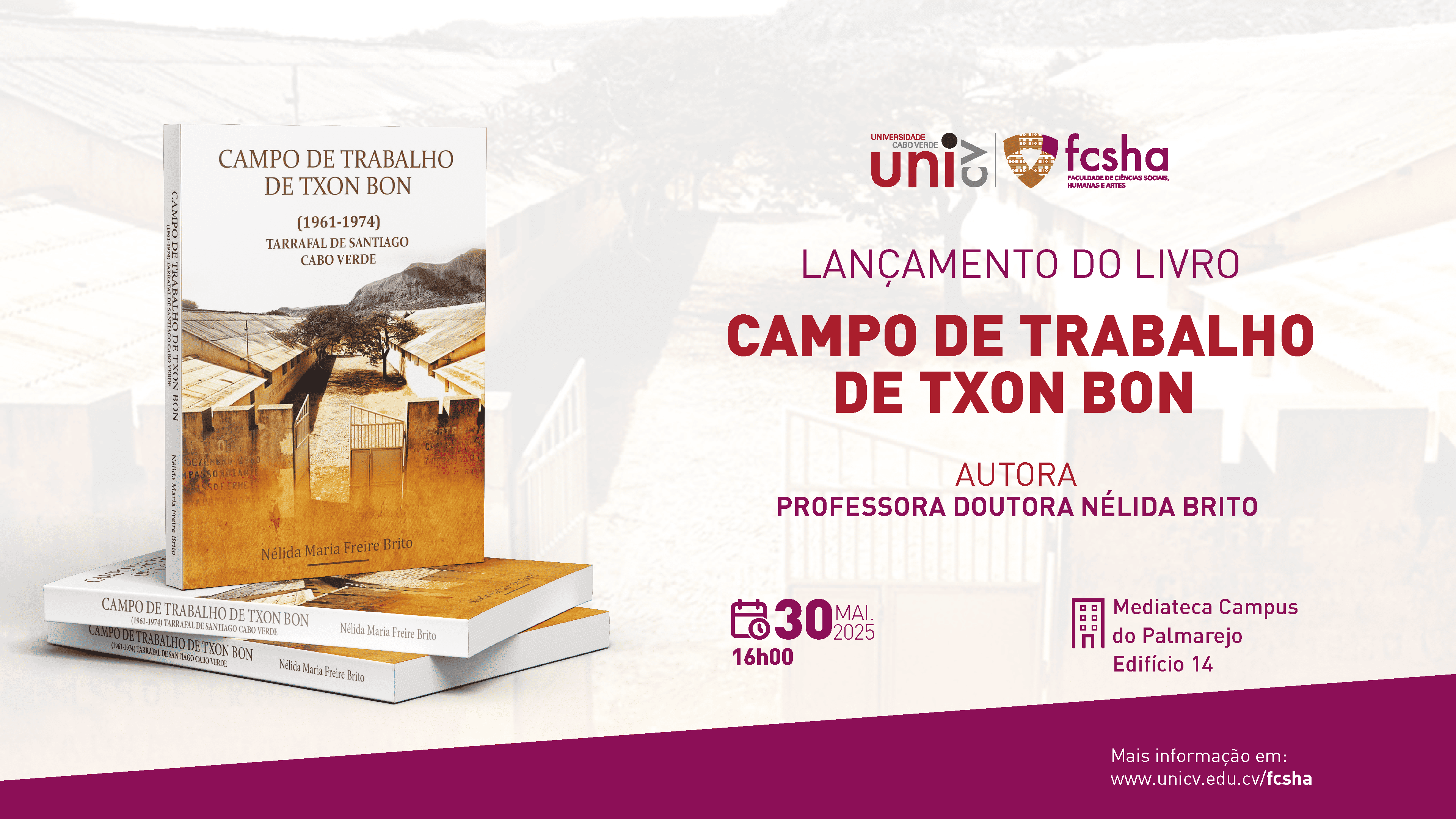 A Faculdade de Ciências Sociais, Humanas e Artes da Universidade de Cabo Verde realiza, no próximo dia 30 de maio de 2025, pelas 16h00, na sala António Correia e Silva-Mediateca, no Campus do Palmarejo Grande, o lançamento do livro “Campo de Trabalho de Txon Bon (1961–1974): Tarrafal de Santiago – Cabo Verde”, da autoria de Nélida Maria Freire Brito.