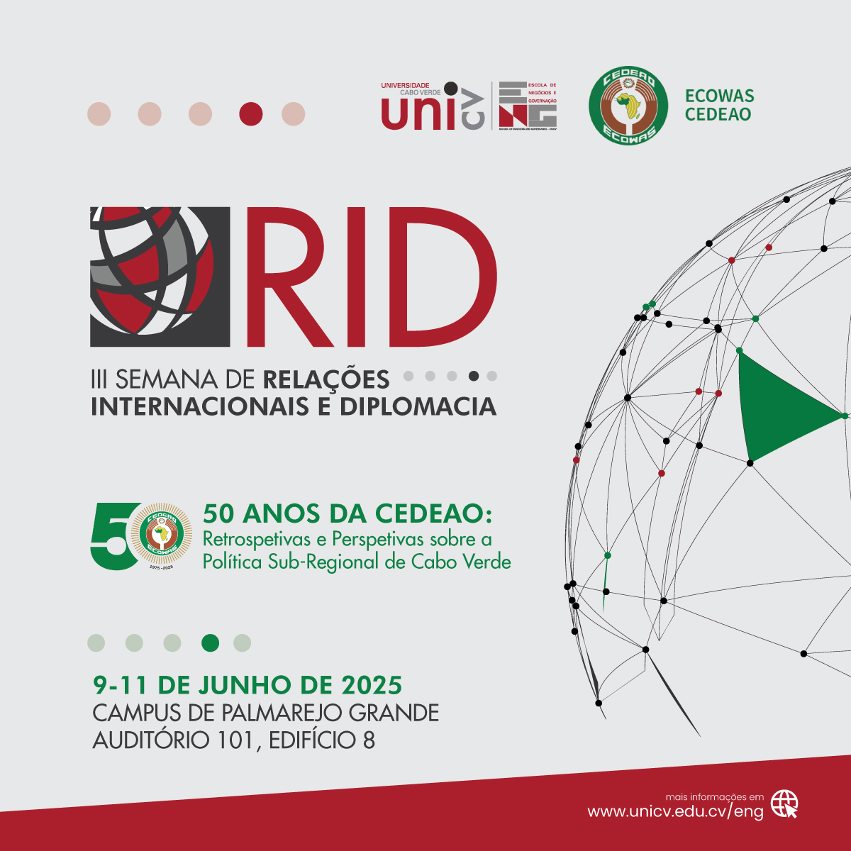 A Universidade de Cabo Verde (Uni-CV), em parceria com a Representação da CEDEAO em Cabo Verde, promoverá, de 9 a 11 de junho de 2025, na Sala 101 do Edifício 8, no Campus do Palmarejo Grande, a III Semana de Relações Internacionais e Diplomacia dedicada à celebração dos 50 anos da Comunidade Económica dos Estados da África Ocidental (CEDEAO). Esta edição propõe-se refletir criticamente sobre o percurso, os desafios contemporâneos e os horizontes de futuro desta organização sub-regional, com especial enfoque na participação de Cabo Verde nas dinâmicas de integração da África Ocidental.