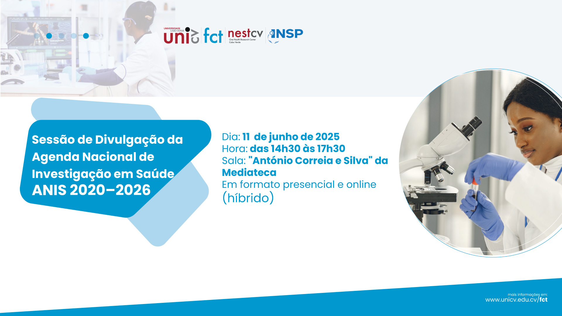O Gabinete de Saúde da Universidade de Cabo Verde, em parceria com o Instituto Nacional de Saúde Pública (INSP), o grupo de investigação NEST-UniCV e  Coordenação do grupo disciplinar de  Enfermagem, promoverá uma Sessão de Divulgação da Agenda Nacional de Investigação em Saúde (ANIS) 2020–2026, com o intuito de fortalecer a ligação entre a comunidade académica e os principais eixos de investigação definidos para o setor da saúde em Cabo Verde.