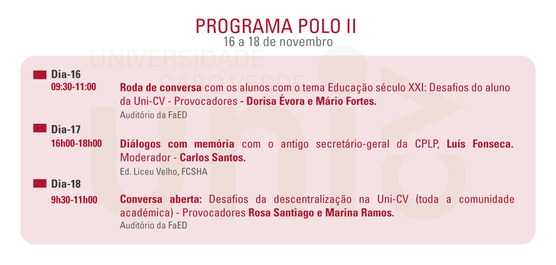 A comemoração oficial vai ser no dia 21 de novembro, às 10:30, no Centro de Convenções do Campus do Palmarejo Grande, e será composta por um momento de abertura, proferido pelo Magnífico Reitor da Uni-CV, Professor Doutor, José Arlindo Barreto. A mesma vai ser também transmitida online no Facebook e Youtube da Uni-CV.