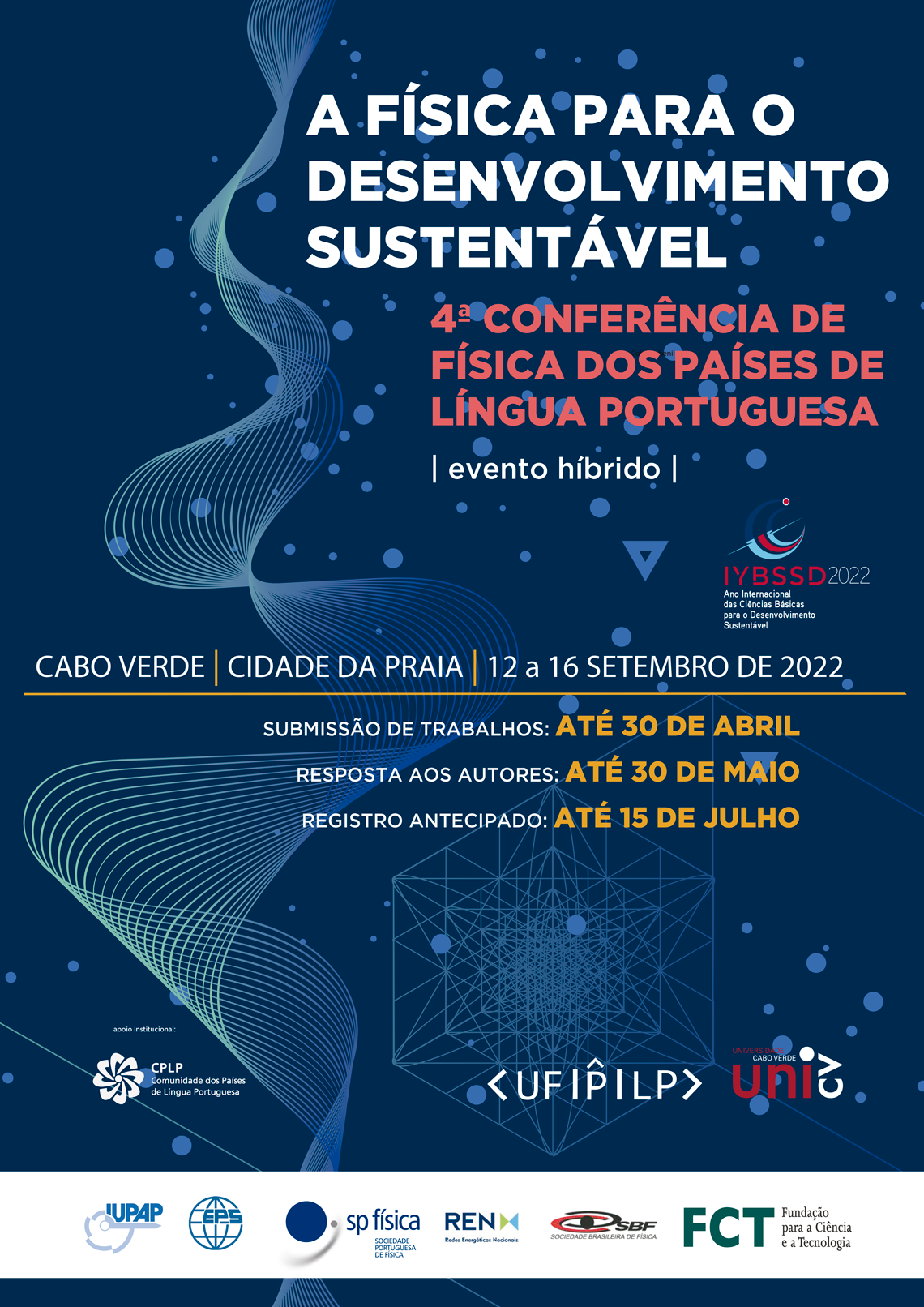 A União de Físicos dos Países de Língua Portuguesa (UFPLP) e a Universidade de Cabo Verde (UNICV) têm a honra de convidar-vos a submeterem trabalhos para a 4ª conferência de Física dos Países da Língua Portuguesa, cujo lema é “Física para o desenvolvimento sustentável”.