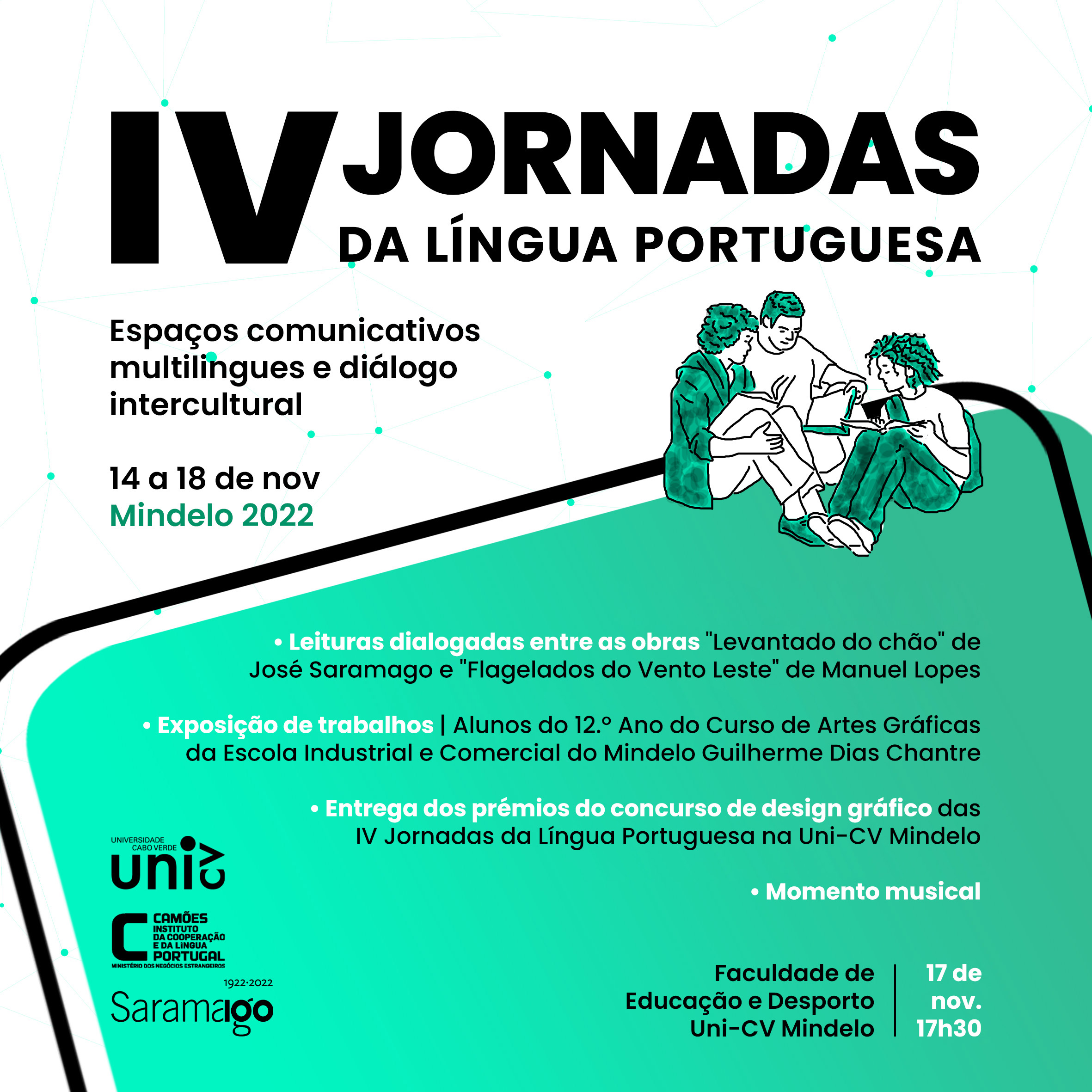A Faculdade de Educação e Desporto da Universidade de Cabo Verde - Mindelo – receberá no dia 17 de novembro, quinta-feira, pelas 17h30, uma sessão de apresentação e inauguração dos trabalhos produzidos pelos alunos do 11.º ano e do 12.º ano do Curso de Artes Gráficas da Escola Industrial e Comercial do Mindelo, Guilherme Dias Chantre, no quadro do programa das IV Jornadas da Língua Portuguesa e do programa comemorativo do centenário de José Saramago.