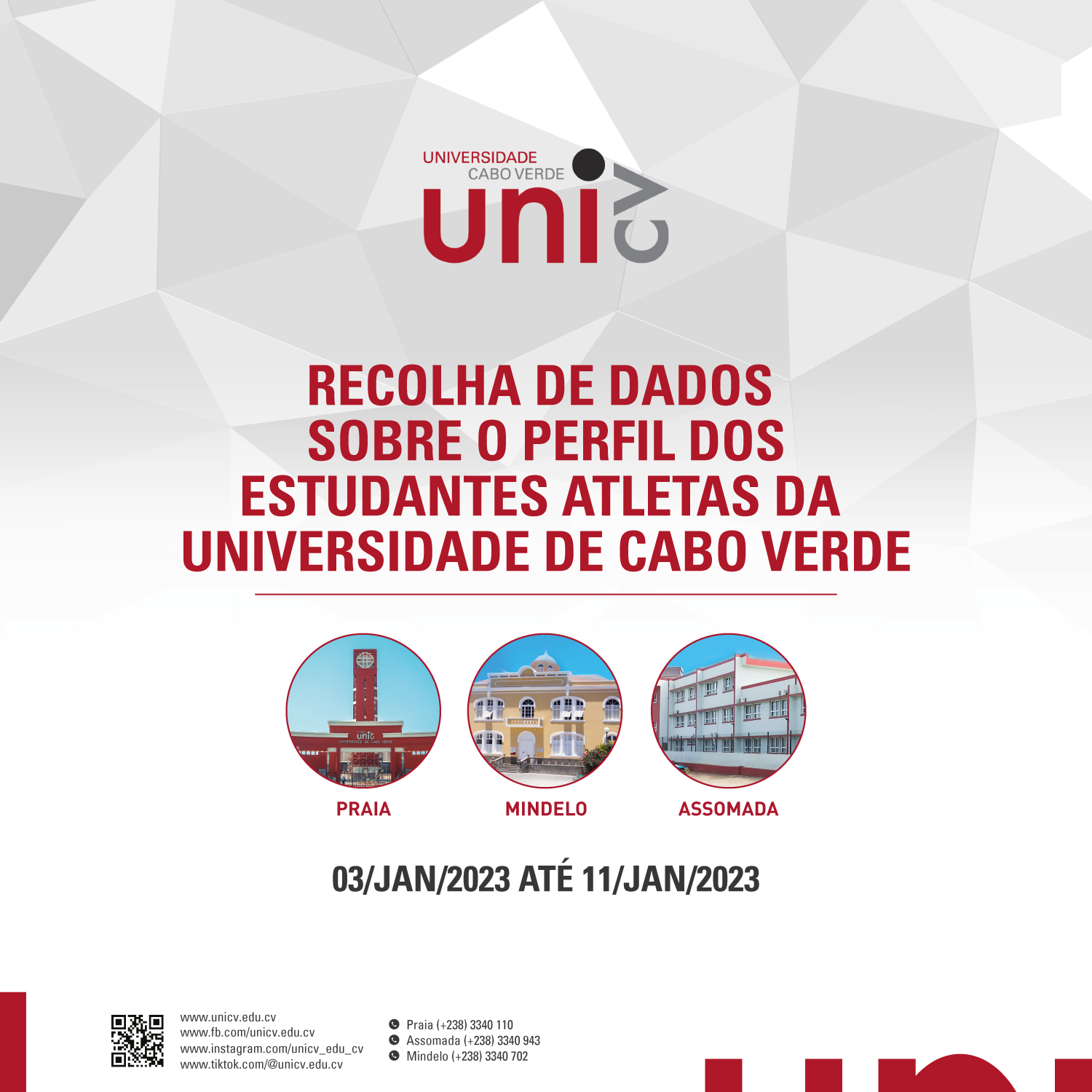 Os Serviços de Ação Social, através da Secção do Desporto e Bem-estar, pretendem fazer uma recolha de dados que tem por finalidade compreender o perfil dos estudantes atletas da Universidade de Cabo Verde, através de identificação de estudantes matriculados nos ciclos de graduação e pós-graduação na Uni-CV, com aptidões desportivas, em diversas modalidades individuais e/ou coletivas, de modo a redefinir a estratégia de implementação do desporto universitário na Uni-CV.