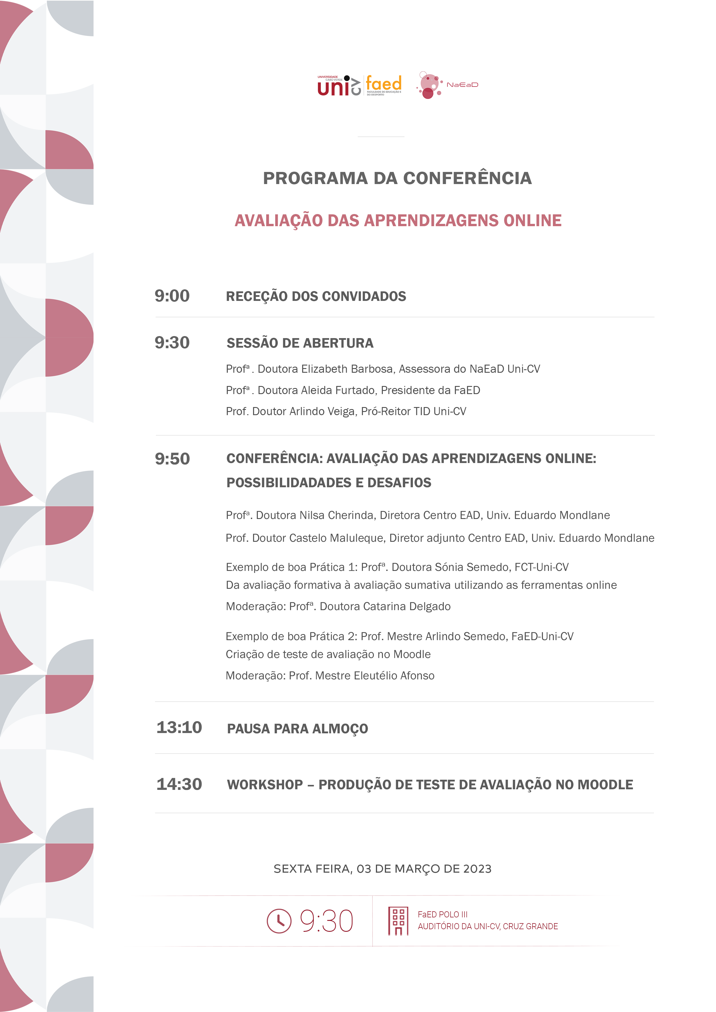 O Núcleo de Apoio ao Ensino a Distância (NaEaD) da Uni-CV, realizará no dia 03 de março, a 1.ª Conferência sobre “Avaliação e Aprendizagens Online”, para debater diferentes cenários de avaliação da nova pedagogia de ensino.