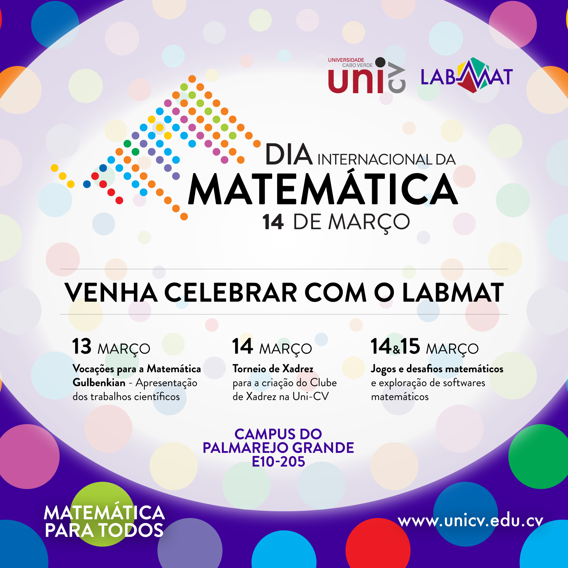 A Universidade de Cabo Verde, através do Laboratório de Matemática, realiza várias atividades alusivas ao Dia Internacional da Matemática, no E10-205 do Campus de Palmarejo Grande.