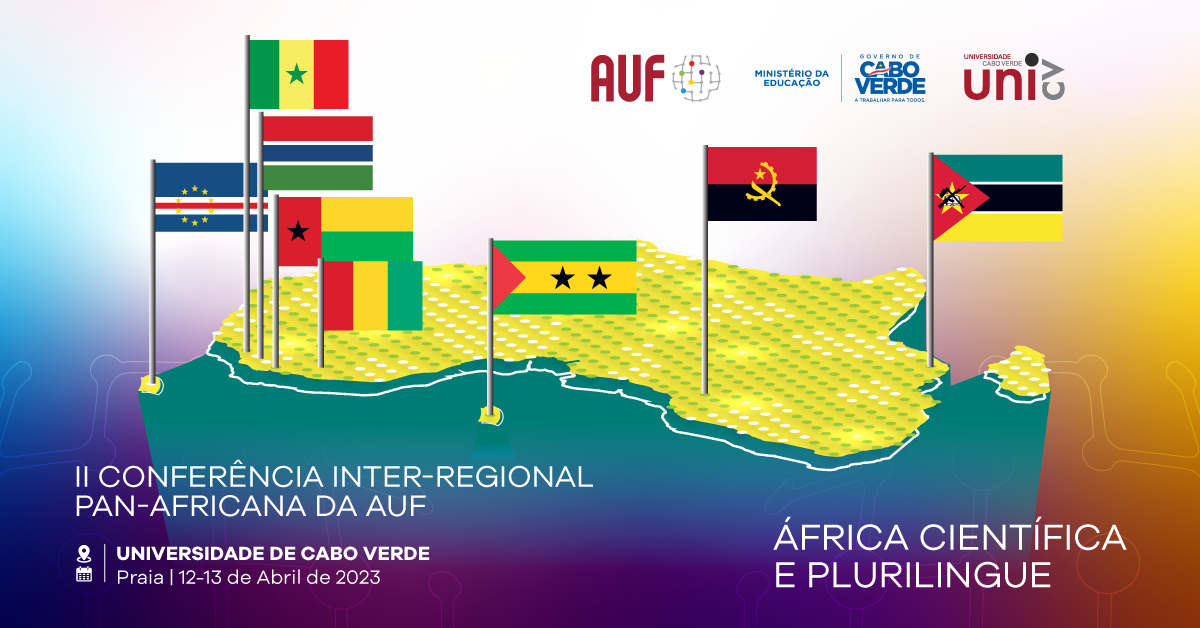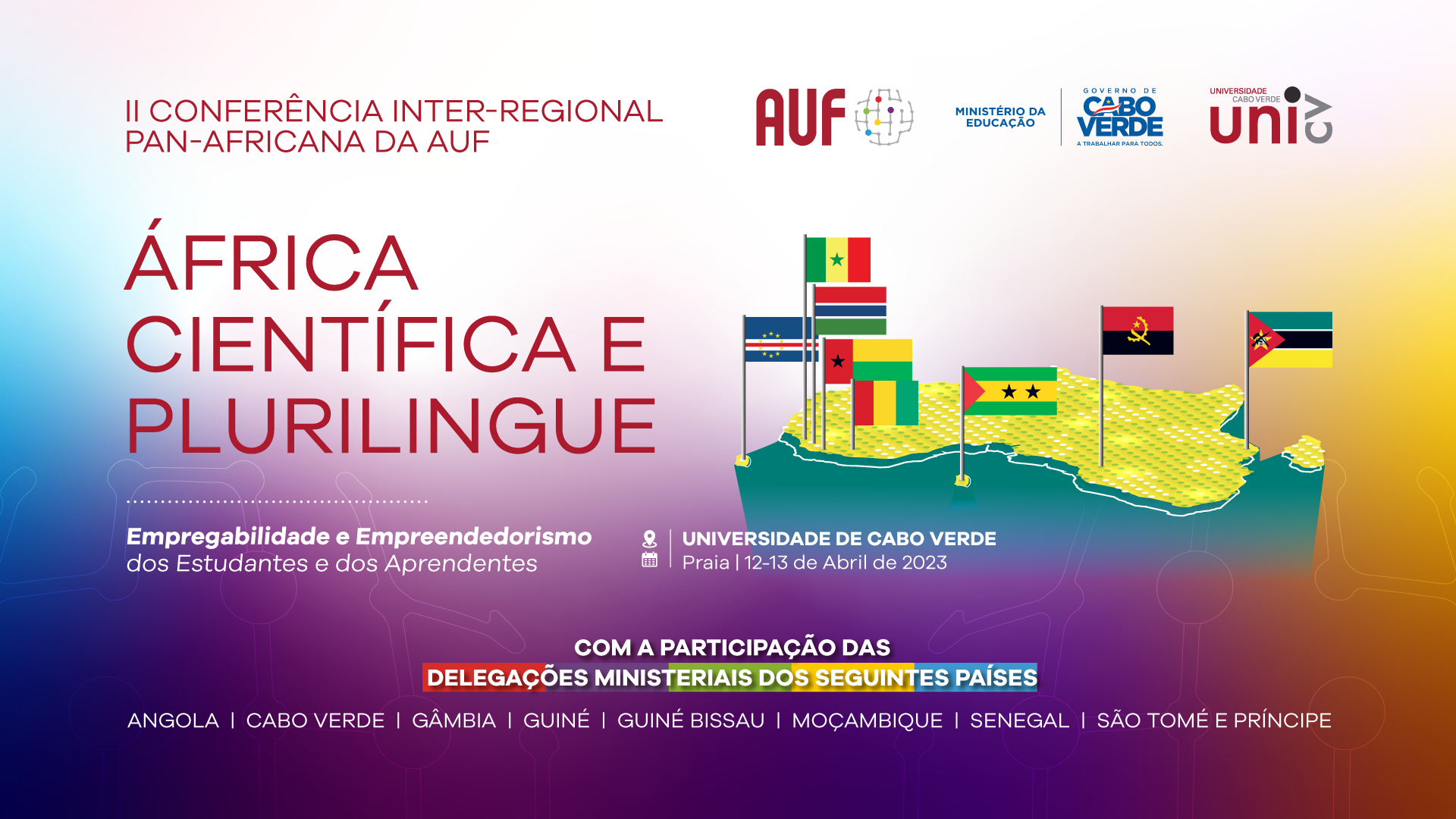 A Agência Universitária da Francofonia (AUF) organiza em parceria com o Ministério da Educação de Cabo Verde e a Universidade de Cabo Verde (Uni-CV), a 2.ª edição da Conferência Inter-regional Pan-africana da AUF: África Científica e Plurilingue, nos dias 12 e 13 de abril de 2023, pelas 9:30 no Centro de Convenções da Uni-CV, Cidade da Praia.