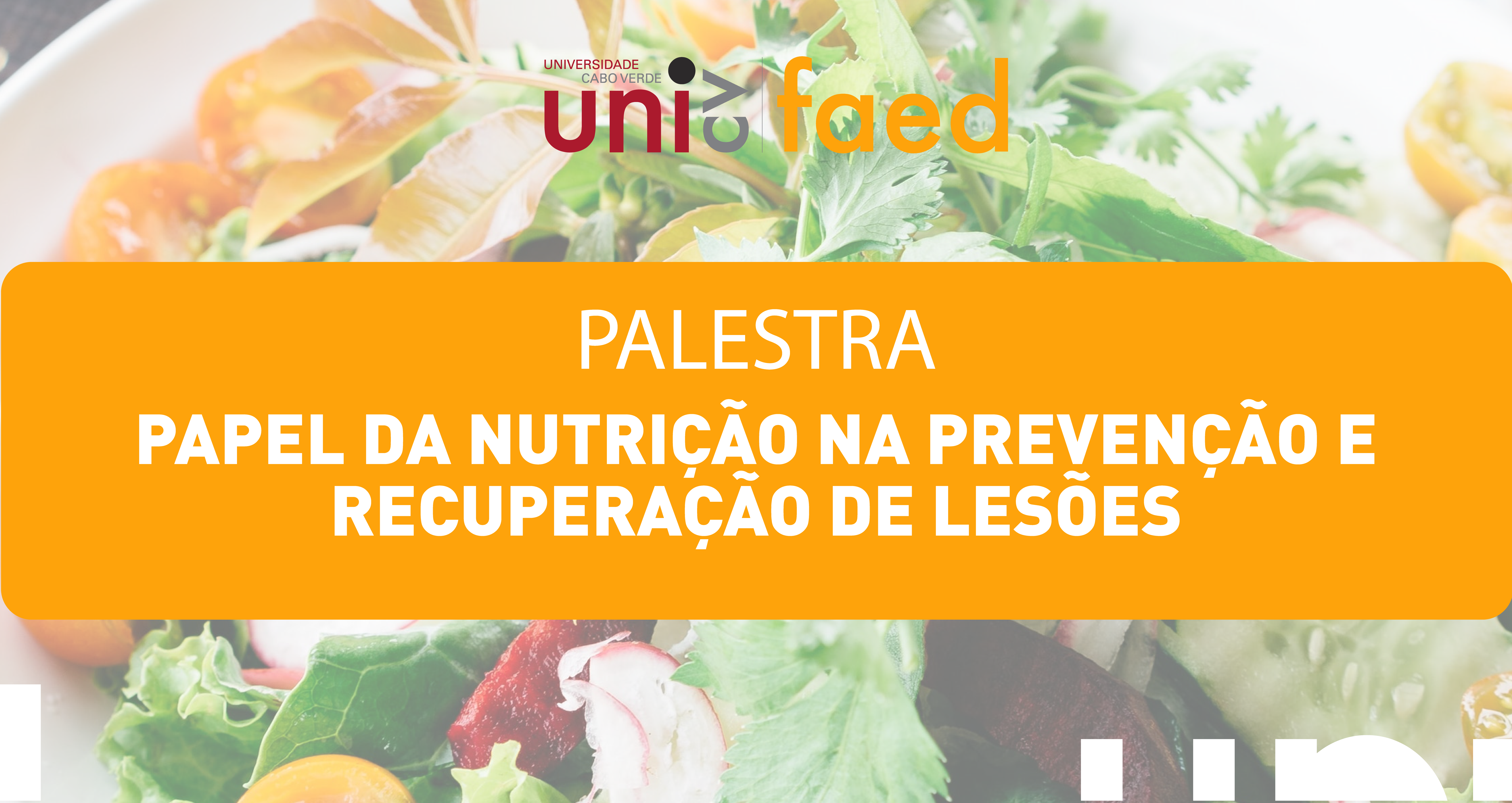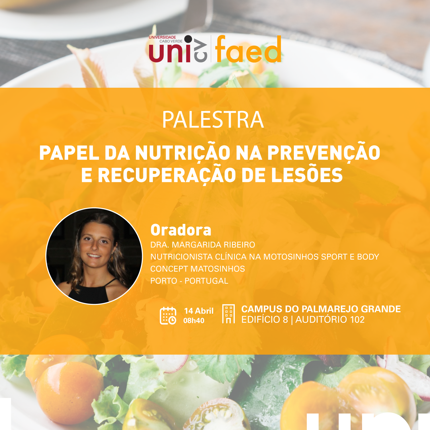 A Universidade de Cabo Verde receberá na próxima sexta-feira, 14 de abril, uma palestra sobre o “Papel da nutrição na prevenção e recuperação de lesões”, ministrada pela Dra. Margarida Queirós Moreira Pinto Ribeiro, Nutricionista Clínica na Motosinhos Sport e Body Concept Matosinhos, Porto, Portugal.