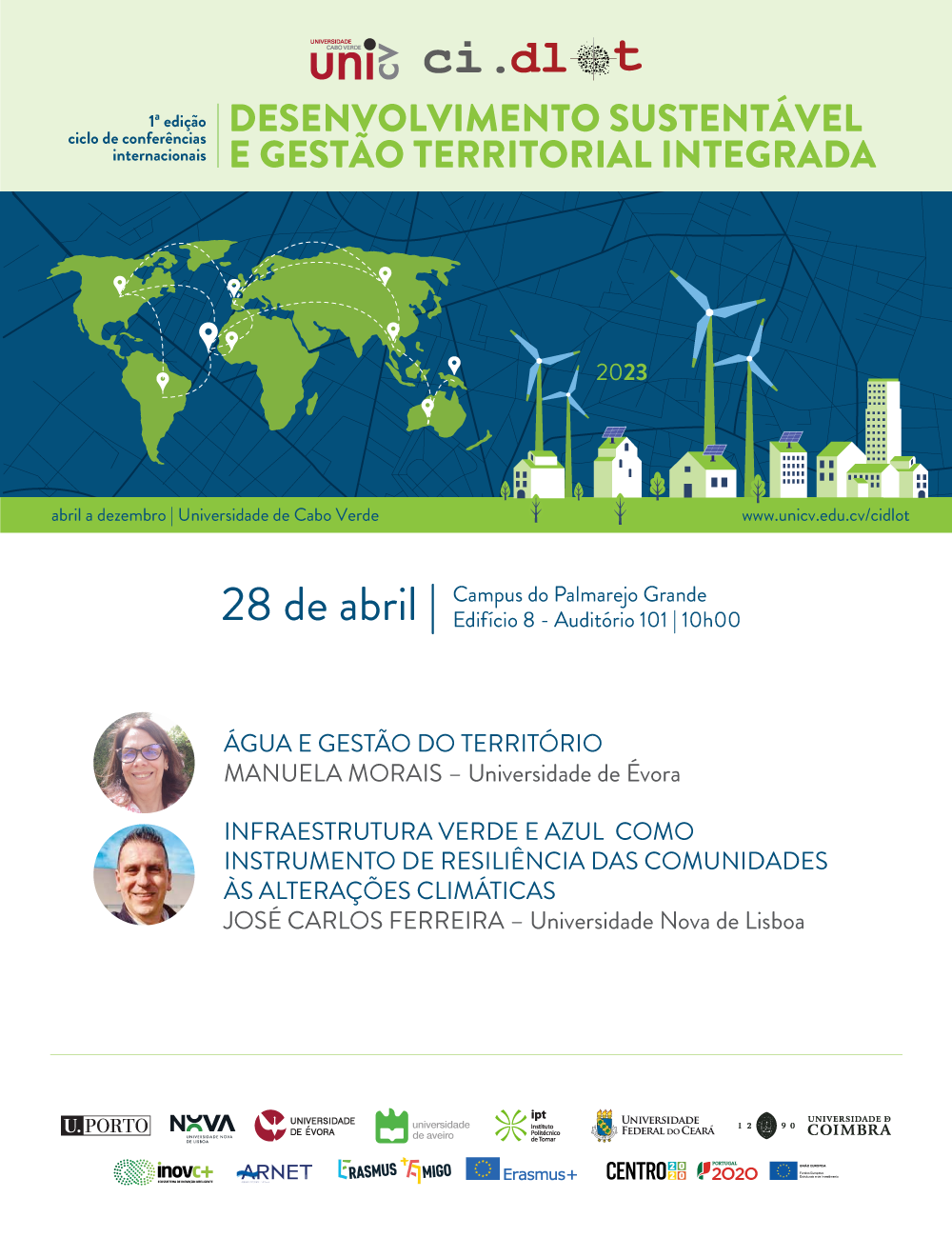 E para dar seguimento a esta edição, no dia 28 de abril participará deste ciclo de conferências, os conferencistas Manuela Morais, da Universidade de Évora, com o tema “Água e Gestão do Território” e José Carlos Ferreira, da Universidade Nova de Lisboa, com o tema “Infraestrutura verde e azul como instrumento de resiliência das comunidades às alterações climáticas.”