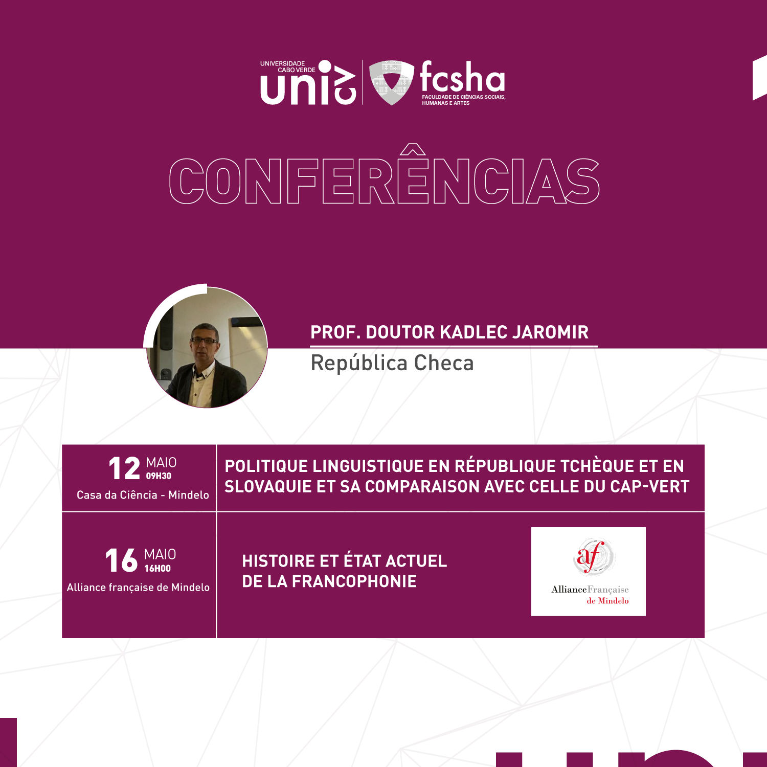 Durante a sua estadia, ele proferirá duas conferências. A primeira no dia 12 de maio, pelas 09h30, na Casa da Ciência do Mindelo, sobre o tema “Politique linguistique en République tchèque et en Slovaquie et sa comparaison avec celle du Cap-Vert”.