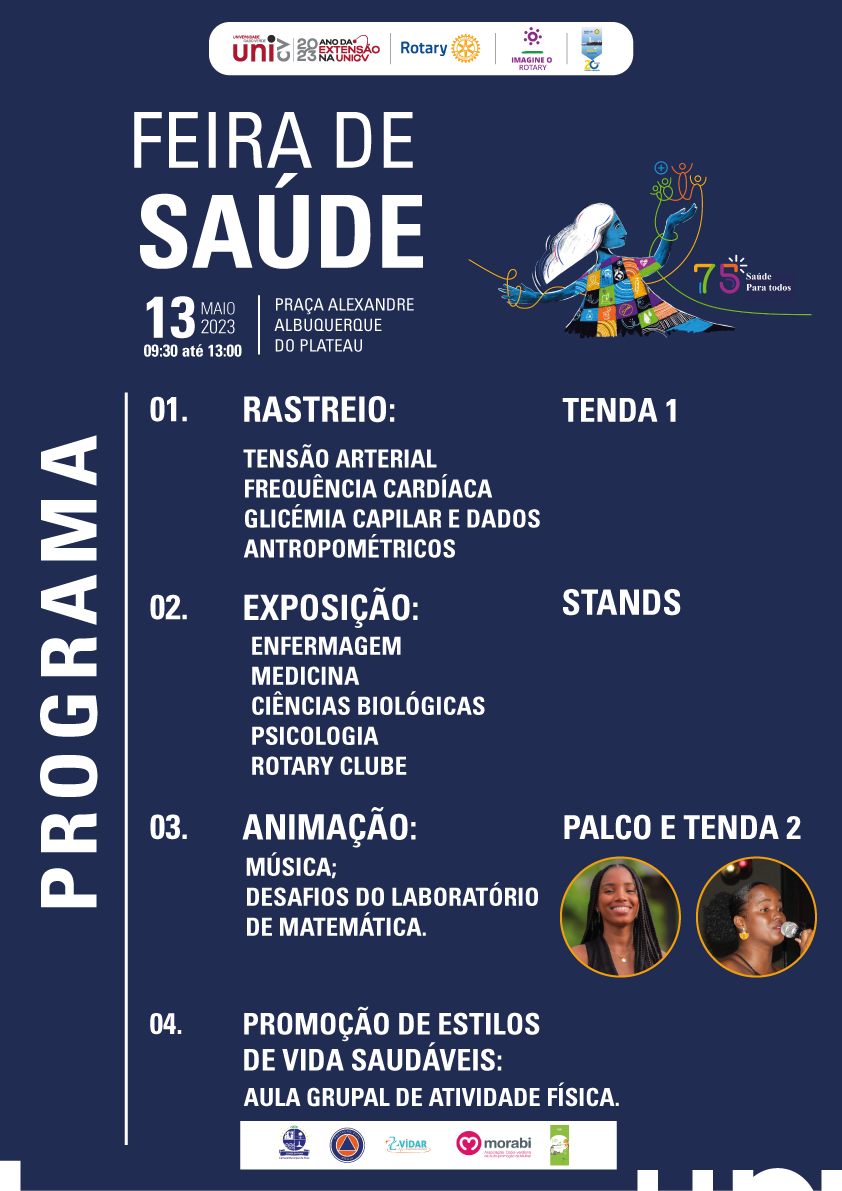Nesse sentido, o Rotary Clube Maria Pia da Praia, o Gabinete de Saúde da Uni-CV e a Coordenação de Enfermagem da Uni-CV pretendem realizar uma Feira de Saúde no dia 13 de maio, sábado, das 9h às 13h, na Praça Alexandre Albuquerque do Plateau, com o objetivo de promover a adoção de hábitos saudáveis de vida, estimulando o autocuidado e contribuindo para uma maior qualidade de vida da população.