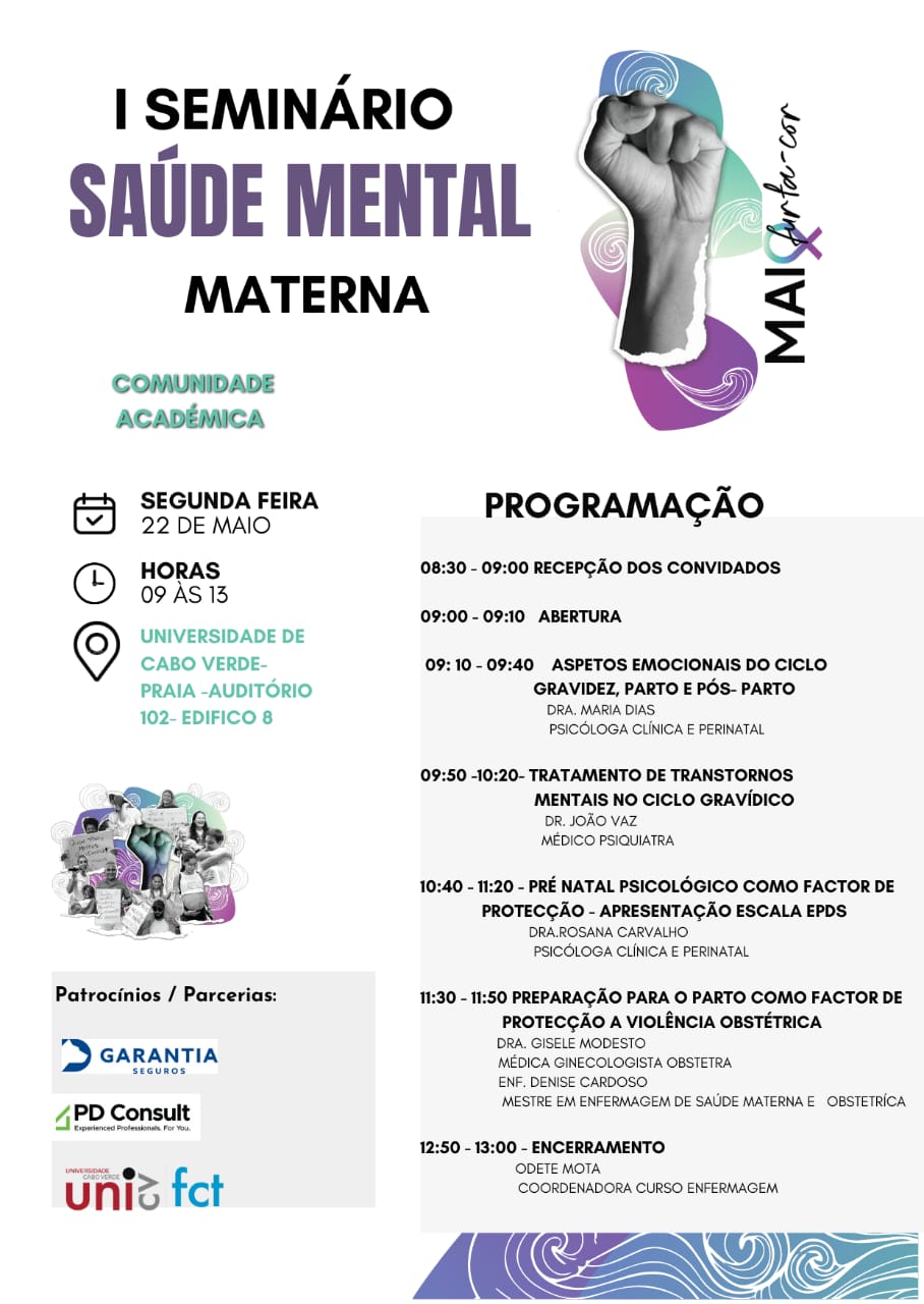 Assim sendo, a Universidade de Cabo Verde receberá, no dia 22 de maio, um seminário intitulado “Saúde Mental Materna”, das 09h00 às 13h00, no Auditório 102 – Ed. 8.
