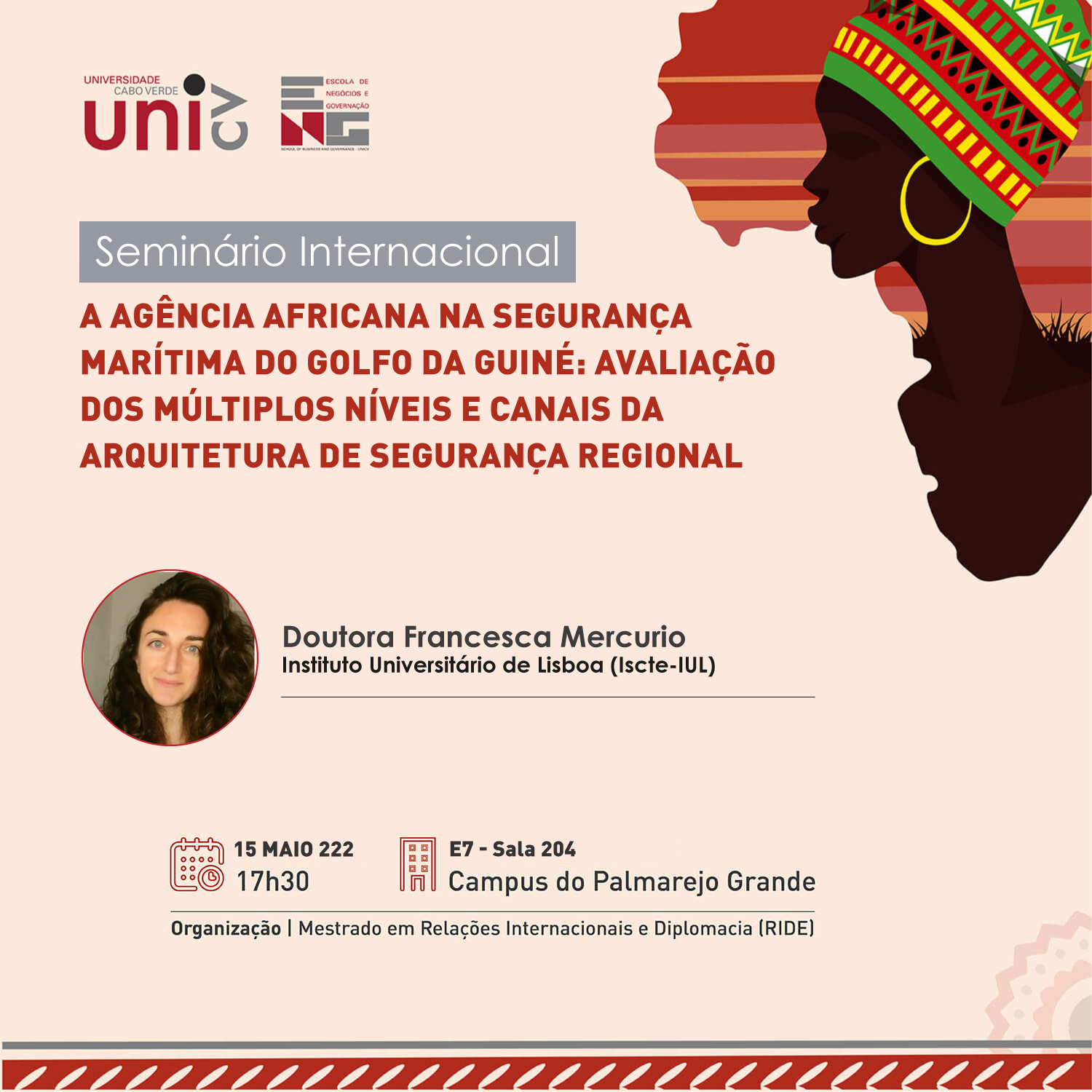 A Direção do Mestrado em Relações Internacionais e Diplomacia Económica (RIDE) da Escola de Negócios e Governação (ENG) da Universidade de Cabo Verde (Uni-CV) organiza um seminário intitulado: “A agência africana na segurança marítima do Golfo da Guiné: avaliação dos múltiplos níveis e canais da arquitetura de segurança regional”.