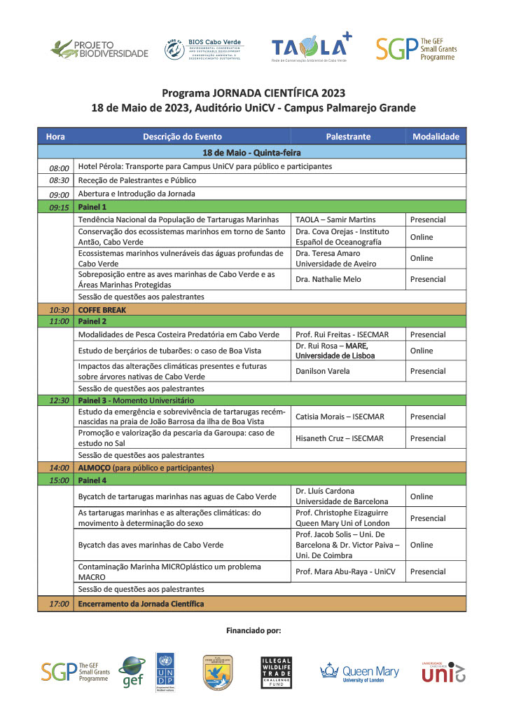 A 1.ª Jornada Científica sobre a Biodiversidade de Cabo Verde tem como objetivo comunicar à sociedade civil os resultados dos estudos e pesquisas feitas no arquipélago, no âmbito da conservação ambiental e da biodiversidade. Contará com a participação de experts nacionais e internacionais, assim como de estudantes nacionais e de todas as Organizações da conservação ambiental de Cabo Verde.