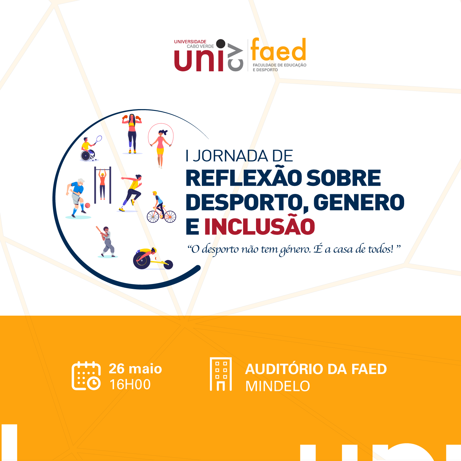 A Universidade de Cabo Verde, através da Faculdade de Educação e Desporto do Polo II – Mindelo – convida a todos a participarem da I Jornada de reflexão sobre Desporto, Género e Inclusão, na próxima sexta-feira, 26 de maio, pelas 16:00 horas.
