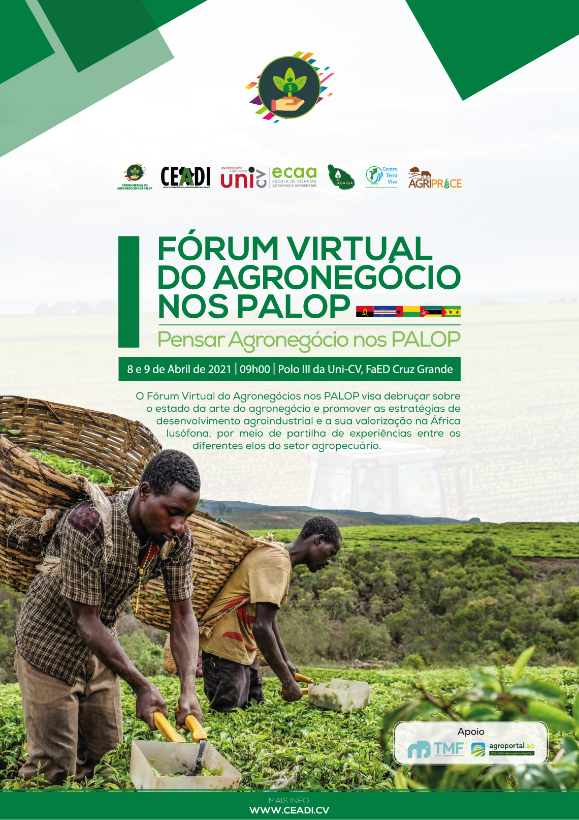 A Escola de Ciências Agrárias e Ambientais da Universidade de Cabo Verde (ECAA/Uni-CV), em parceria com o Centro de Estudos Africanos para Desenvolvimento e Inovação (CEADI), organiza, entre os dias 8 e 9 de abril, o 1º Fórum Virtual do Agronegócio nos Países Africanos de Língua Oficial Portuguesa (PALOP), sob lema "Pensar o Agronegócio nos PALOP, o Presente e o Futuro".