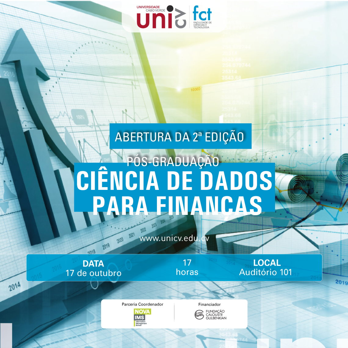 A Faculdade de Ciências e Tecnologia da Universidade de Cabo Verde convida toda a comunidade académica a fazer parte da sessão de abertura da Segunda Edição do Curso de Pós-Graduação em Ciência de Dados para Finanças, seguida de uma aula inaugural proferida pelo Professor Doutor Jorge Bravo.