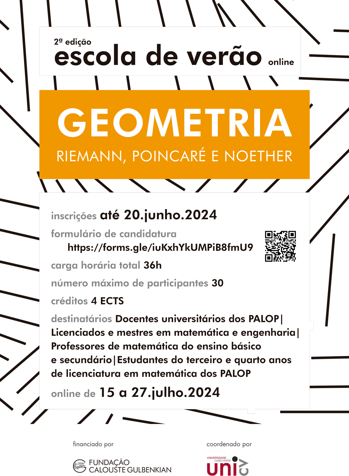 A Fundação Calouste Gulbenkian e o Laboratório de Matemática da Universidade de Cabo Verde informam que está aberto um concurso para frequência, online, da II Escola de Verão em Geometria da Universidade de Cabo Verde (Riemann, Poincaré e Noether). Este concurso é destinado a 30 estudantes dos cursos de licenciatura em Matemática ou professores de Matemática, nacionais e residentes de Angola, Cabo Verde, Guiné-Bissau, Moçambique e São Tomé e Príncipe, que demonstrem interesse pelo aprofundamento dos conhecimentos teóricos e práticos de Geometria e suas aplicações, especialmente no ensino.