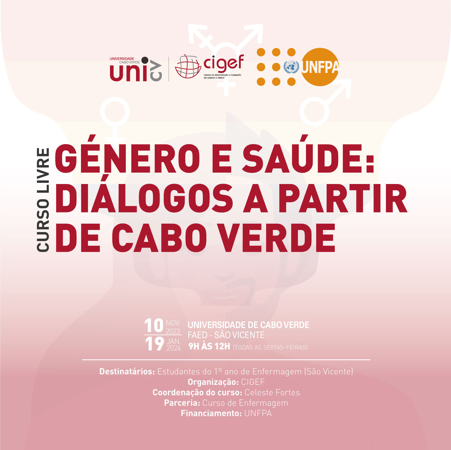 O Centro de Investigação e Formação em Género e Família (CIGEF) em parceria com a coordenação do curso de Enfermagem, e financiamento do Fundo de População das Nações Unidas (UNFPA), realizará um curso livre para os estudantes do 1.º ano da licenciatura em Enfermagem do Polo II, São Vicente.