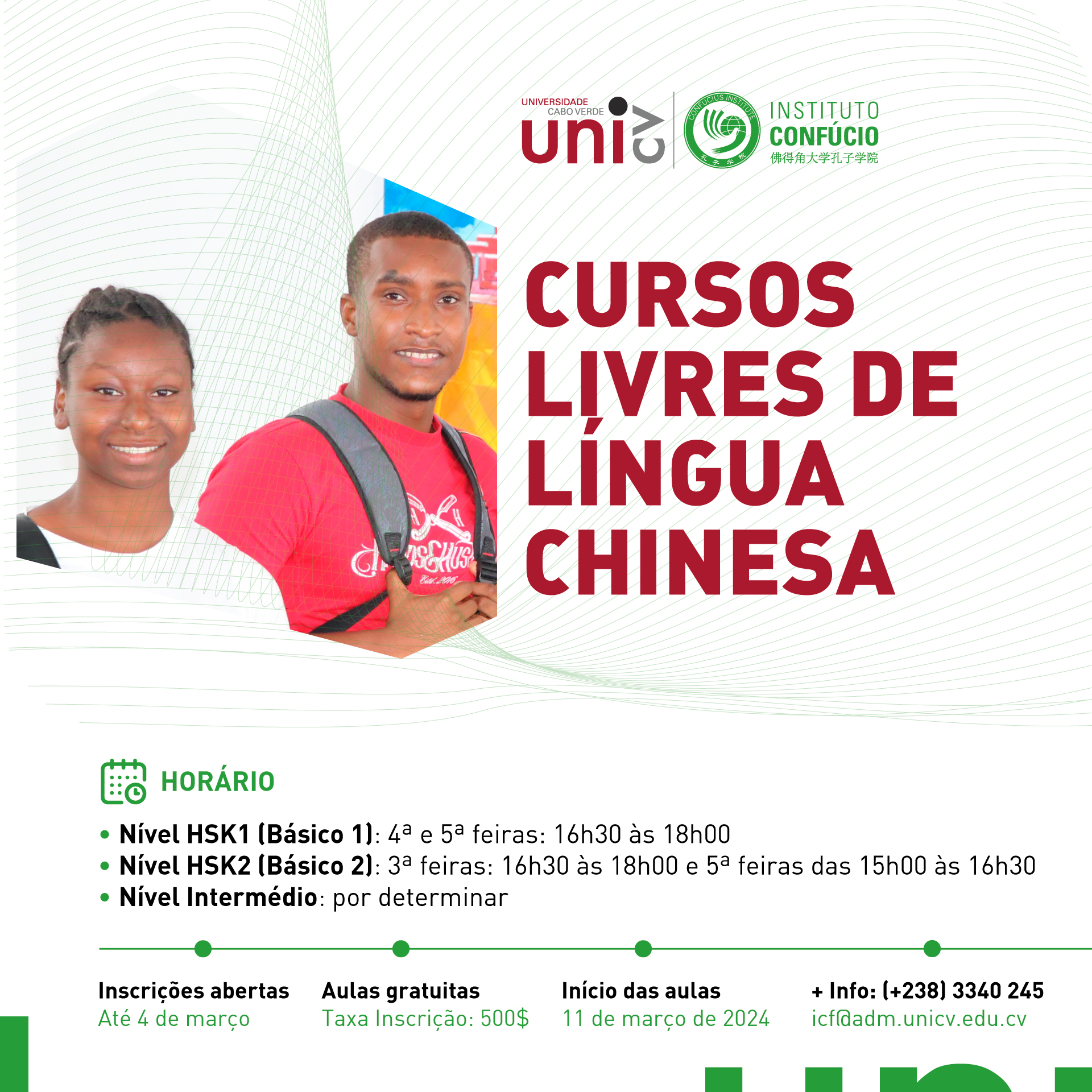 O Instituto Confúcio na Universidade de Cabo Verde informa a todos os estudantes, professores e público em geral já se encontra aberta a fase de inscrições para os Cursos Livres de Língua Chinesa na Uni-CV.