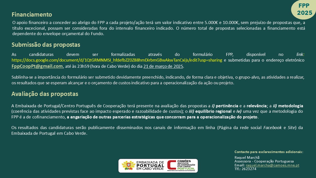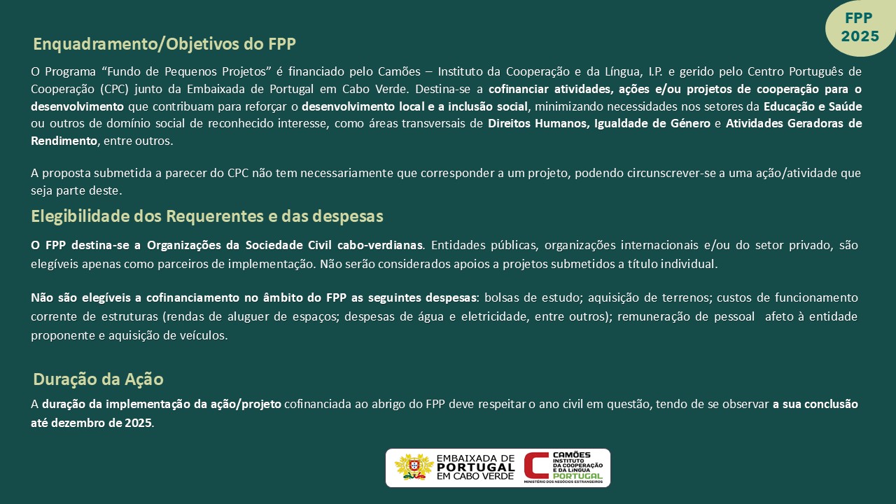 A Embaixada de Portugal / Cooperação Portuguesa em Cabo Verde informa que se encontram abertas as candidaturas ao programa local "Fundo de Pequenos Projetos (FPP)", financiado pelo Camões - Instituto da Cooperação e da Língua.